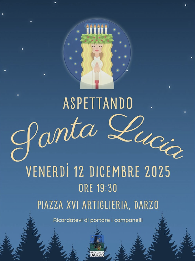Venerdì 12 dicembre 2025, Darzo accoglie Aspettando Santa Lucia, un appuntamento serale in Piazza XVI Artiglieria a partire dalle 19:30.