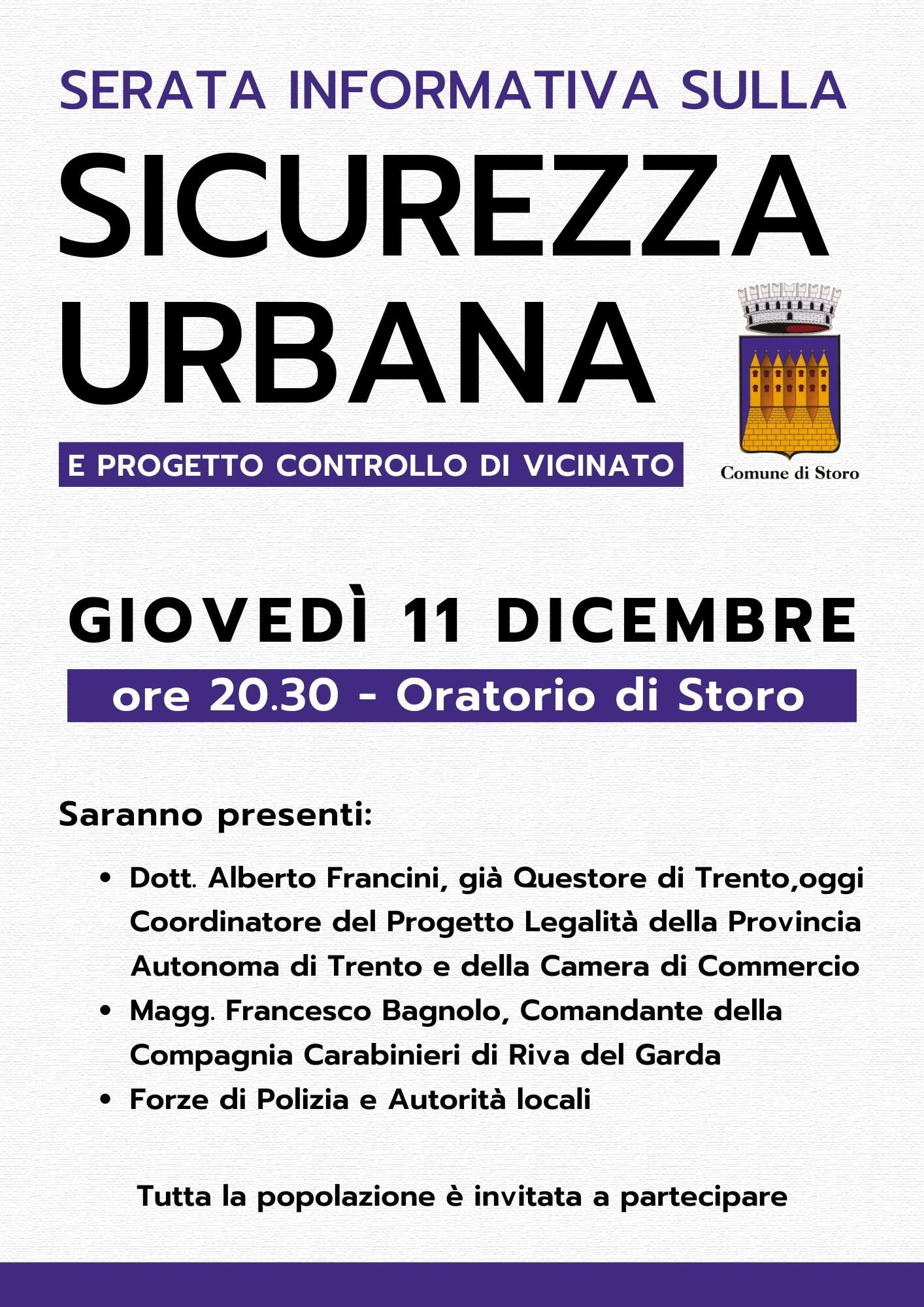 Giovedì 11 dicembre alle 20:30 l’Oratorio di Storo ospita una serata informativa dedicata alla sicurezza urbana e al progetto Controllo di Vicinato.Interverranno Alberto Francini, Francesco Bagnolo, le Forze di Polizia e le autorità locali.